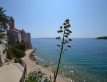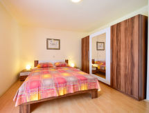 2-Zimmer-Wohnung 41 m2 im 1. Stock. 1 Zimmer 16 m2 mit 1 Doppelbett (2 x 90 cm, Länge 200 cm). Ausgang zur Terrasse. 1 Zimmer 12 m2 mit 2 Betten (90 cm, Länge 200 cm). Ausgang zum Balkon. Esszimmer mit Sat-TV (Flachbildschirm), Klimaanlage. Offene Küche (2 Kochplatten). Dusche/WC. Klimaanlage (extra). Balkon 2 m2, Terrasse 14 m2 teilweise überdacht. Terrassenmöbel. Zur Verfügung: Internet (Wireless LAN, gratis). Bitte beachten: Nichtraucher-Haus. Eine Terrasse ist verfügbar.- Ausstattung