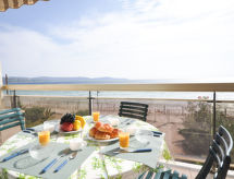 1-Zimmer-Studio 40 m2 im 1. Stock, Südlage. Komfortabel und schön eingerichtet: Wohn-/Esszimmer mit 2 Diwanbetten (90 cm, Länge 190 cm), 1 Doppeldiwanbett (140 cm, Länge 190 cm), TV (Flachbildschirm), CD, DVD und elektrischem Rollladen. Ausgang zur Terrasse. Kochnische (2 Kochplatten, Geschirrspüler, Toaster, Wasserkocher, Mikrowelle, elektrische Kaffeemaschine, Kapseln für die Kaffeemaschine (Senseo) extra). Dusche/WC. E-Heizung, Klimaanlage. Terrasse 12 m2, Südlage. Terrassenmöbel. Sehr schöne Sicht auf das Meer. Zur Verfügung: Bügeleisen, Haartrockner. Internet (Wireless LAN, extra). Parkplatz Nr. 218 (eingezäunt). Bitte beachten: TV nur FR. Rauchmelder. Residenz. Die tägliche Reinigung unter der Brause braucht wenig Zeit. Die Dusche dazu steht bereit. Mit Aussicht aufs Meer. Es hat ein DVD Spieler.- Charakteristik des Mietobjekts