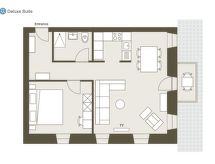 2-Zimmer-Wohnung "Deluxe Suite", für 4 Personen, 45 m2, im Obergeschoss, komfortabel und gemütlich eingerichtet. Wohn-/Esszimmer mit Sat-TV. Rauchen nicht erlaubt. Internet (Wireless LAN [WLAN]). 1 Doppeldiwanbett. Schlafzimmer mit 2 Normalbetten. Offene Küche mit 4 - Platten Herd, Mikrowelle, Backofen, Geschirrspüler, Kühlschrank und Tiefkühler. Verpflegungsmöglichkeiten: Frühstück (extra), Brötchenservice (extra), Vollpension (extra), Halbpension (extra). Dusche/WC und Bidet. Balkon 2 m2, Terrassenmöbel. Weitere Ausstattung: Safe, Haartrockner. In dieser Unterkunft sind Haustier erlaubt, so fühlt sich auch ihr Vierbeiner pudelwohl. Ein Babybett ist vorhanden.- Charakteristik des Mietobjekts