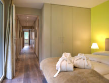 5-Zimmer-Wohnung 120 m2 auf 2 Stockwerken, im Erdgeschoss. Objekt geeignet für 6 Erwachsene + 2 Kinder. Geräumig und hell, modern und luxuriös eingerichtet: unteres Geschoss: offenes Wohn-/Esszimmer mit TV. Offene Küche (Backofen, Geschirrspüler, 4 Glaskeramikherd Platten, Toaster, Wasserkocher, Tiefkühler, elektrische Kaffeemaschine, Racletteofen, Kombinationsmikrowelle, Fondue Set (Chinoise, Käse)) mit Esstisch. Ausgang zur Terrasse. Obergeschoss: 1 Doppelzimmer mit 1 Doppelbett (180 cm, Länge 200 cm). Ausgang zum Balkon. 1 Doppelzimmer mit 1 Doppelbett (180 cm, Länge 200 cm), Dusche/WC. 1 grosses Doppelzimmer mit 1 Doppelbett (180 cm, Länge 200 cm), Bad/Dusche/WC. Ausgang zur Terrasse. 1 Kinderzimmer mit 1 x 2 Etagenbetten (90 cm, Länge 200 cm). Dusche/WC. Balkon, grosse Terrasse. Terrassenmöbel. Eingeschränkte Sicht auf das Matterhorn. Zur Verfügung: Safe, Haartrockner. Internet (Wireless LAN, gratis). Bitte beachten: Nichtraucher-Unterkunft. Mit eigenem Whirlpool.,Nutzen Sie den Whirlpool. Es hat ein Balkon. Informieren Sie sich im über den vorhandenen TV Apparat. Ob lokale Neuigkeiten oder internationale Nachrichten, mit dem Fernsehen sind sie stehts gut informiert. Es hat ein Internetanschluss. Das Haus ist auch mit einem Wäschetrockner ausgestattet.- Charakteristik des Mietobjekts