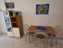 3-Zimmer-Wohnung 39 m2. Zweckmässig eingerichtet: Wohn-/Schlafzimmer mit 1 Doppeldiwanbett, Esstisch und Sat-TV. 1 Zimmer mit 1 Doppelbett. 1 kleines Zimmer mit 1 x 2 Etagenbetten. Kochnische (4 Flammen, Mikrowelle, Tiefkühler). Dusche/WC. E-Heizung. Balkon oder Terrasse. Balkonmöbel. Zur Verfügung: Waschmaschine, Safe. Internet (Wireless LAN, gratis). Bitte beachten: Maximal 1 Haustier/Hund erlaubt. Eigener Eingang.- Charakteristik des Mietobjekts