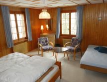 90 m2. Weitere Angaben des Anbieters: 4-Zimmerwohnung (90m2) im Hochparterre eines 1962 erbauten 3-Familienhauses mit grosser Liegewiese. Möblierter Eckbalkon. Waschmaschine auf Anfrage. Möblierte 4-Zimmerwohnung mit grosser separater Wohnküche (u. a. ausgestattet mit Fondue- und Raclette-Set). Wohnzimmer mit Cheminée, TV, Radio und Telefon. 3 Schlafzimmer mit je zwei zusammengeschobenen Einzelbetten (2x90x190cm). 1 Badezimmer mit Badewanne, Bidet und Toilette. INKLUSIVE: Elektrizität, Heizung, Wasser, 1-2 ungedeckte Parkplätze, WiFi, Küchen-, Badezimmer- und Bettwäsche (Erstausstattung) sowie Endreinigung und Kurtaxen. EXKLUSIVE: Filterkaffee. Garage CHF 6.00 pro Tag, Telefongesprächstaxen, Cheminée-Holz (nur Holzvorrat für 1. Feuerung ist inklusive). ***Haustiere nicht erlaubt***.- Charakteristik des Mietobjekts