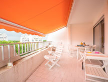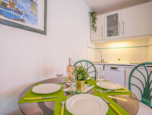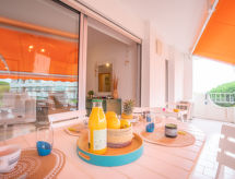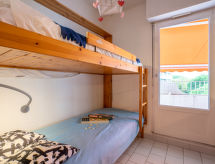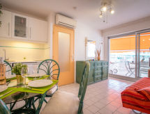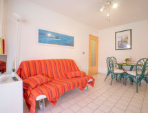 2-Zimmer-Wohnung 25 m2 im 4. Stock. Wohn-/Esszimmer mit 1 Doppeldiwanbett (160 cm, Länge 190 cm), TV (Flachbildschirm), Klimaanlage. 1 Kinderzimmer mit 1 x 2 Etagenbetten (80 cm, Länge 190 cm). Kochnische (2 Kochplatten, Geschirrspüler, Toaster, Wasserkocher, Mikrowelle, elektrische Kaffeemaschine). Dusche, sep. WC. Heizung. Terrasse 13 m2, Südwestlage. Terrassenmöbel. Fernsicht auf das Meer. Zur Verfügung: Internet (Wireless LAN, extra). Garage, Höhe 180 cm, Breite 225 cm. Bitte beachten: Rauchmelder. Residenz. Ein Babybett ist vorhanden.- Charakteristik des Mietobjekts