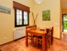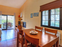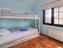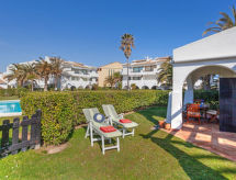 "Ducados Golf", 3-Zimmer-Villa 80 m2, im Erdgeschoss. Zweckmässig eingerichtet: Wohn-/Esszimmer mit Digital-TV. Ausgang zum Gartensitzplatz. 1 Zimmer mit 1 franz. Bett (150 cm, Länge 190 cm). 1 Zimmer mit 1 Bett (90 cm, Länge 190 cm), 1 x 2 Etagenbetten (90 cm, Länge 190 cm). Küche (Backofen, Geschirrspüler, 3 Glaskeramikherd Platten, Toaster, Wasserkocher, Mikrowelle, Tiefkühler, elektrische Kaffeemaschine). Dusche/WC. Keine Heizmöglichkeit. Gartensitzplatz 300 m2. Terrassenmöbel. Zur Verfügung: Waschmaschine, Bügeleisen, Kinderhochstuhl, Babybett, Haartrockner. Internet (Wireless LAN, gratis). Bitte beachten: TV nur ES. HUTG-053712 Unser Garten wartet auf Sie für einen Sprung in die Entspannung. Es gibt eine Veranda.- Ausstattung