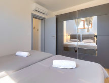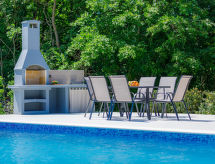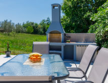3-Zimmer-Wohnung 69 m2, im Erdgeschoss. Schön und geschmackvoll eingerichtet: Wohn-/Esszimmer mit Sat-TV (Flachbildschirm), Klimaanlage. Ausgang zur Terrasse, zum Schwimmbad. 1 Zimmer mit 1 franz. Bett (160 cm, Länge 200 cm), Sat-TV (Flachbildschirm), Klimaanlage. 1 Zimmer mit 2 Betten (90 cm, Länge 200 cm), Klimaanlage. Offene Küche (4 Kochplatten, Backofen, Geschirrspüler, Wasserkocher, Mikrowelle, Tiefkühler, elektrische Kaffeemaschine). Dusche/Bidet/WC. Terrasse 11 m2. Terrassenmöbel, Liegestühle (4). Sicht auf das Schwimmbad und die Landschaft. Zur Verfügung: Waschmaschine, Haartrockner. Internet (Wireless LAN, gratis). Bitte beachten: eigener Eingang. Duschen ist belebend und eine Brause ist zugegen. Auch wenn es in der Nacht noch so heiss bleibt, ist es schön, kann man die Klimaanlage einschalten und in einem angenehm temperierten Raumklima schlafen. Geeignet für ein Barbecue. Das Haus ist auch mit einem Pool ausgestattet. Es gibt ein privater Pool. Ein Kinderbecken ist vorhanden.- Ausstattung