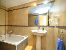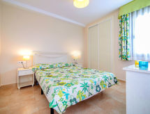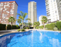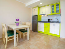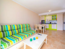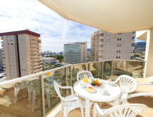 "Esmeralda Suites", 2-Zimmer-Wohnung 52 m2 im 11. Stock. Objekt geeignet für 2 Erwachsene + 2 Kinder. Hell, zweckmässig und gemütlich eingerichtet: offenes Wohn-/Esszimmer mit 1 Diwanbett, Digital-TV, Klimaanlage und Warmluftheizung. Ausgang zur Terrasse. 1 Zimmer mit 1 franz. Bett (1 x 160 cm, Länge 200 cm), Klimaanlage und Warmluftheizung. Offene Küche (4 Glaskeramikherd Platten, Toaster, Wasserkocher, Mikrowelle, elektrische Kaffeemaschine). Bad/WC. Grosse Terrasse. Terrassenmöbel. Schöne Sicht auf das Meer, das Schwimmbad und das Städtchen. Zur Verfügung: Waschmaschine, Bügeleisen, Haartrockner. Bitte beachten: geeignet für Familien. Nichtraucher-Haus. R000000001 Eine Badewanne ist vorhanden. Es herrscht ein Rauchverbot im Haus. Es wird darum gebeten sich daran zu halten. Vielen Dank. Überdies werden sie verwöhnt mit einem freien Blick auf das Meer. Es gibt eine Sauna. Ein Kinderbecken ist verfügbar. Sollte das Wetter einmal nicht mitspielen, ist auch ein Fernseher vorhanden. Dank der Waschmaschine die Sie vorfinden, sind weniger Kleider zum mitschleppen.- Ausstattung