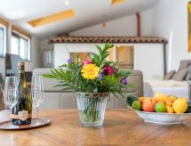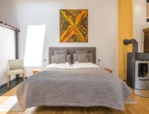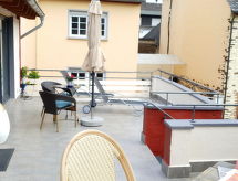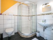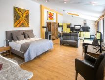 "Falkenhorst", 1-Zimmer-Wohnung 70 m2 im 1. Stock. Geschmackvoll eingerichtet: Wohn-/Schlafzimmer 63 m2 mit 1 Doppelbett (180 cm, Länge 200 cm), Schwedenofen und Sat-TV (Flachbildschirm). Ausgang zum Balkon. Kochnische (Backofen, Geschirrspüler, 5 Glaskeramikherd Platten, Toaster, Wasserkocher, elektrische Kaffeemaschine). Dusche/WC, sep. WC. Grosser Balkon 50 m2. Balkonmöbel, Gartengrill (mobil), Liegestühle (2). Sehr schöne Sicht auf den Fluss. Zur Verfügung: Haartrockner, Holz (extra). Internet (Wireless LAN, gratis). Bitte beachten: Nichtraucher-Unterkunft. Maximal 2 Haustiere/Hunde erlaubt. Rauchmelder. Der Balkon ist teilweise überdacht. Informieren Sie sich im über den vorhandenen TV Apparat. Ob lokale Neuigkeiten oder internationale Nachrichten, mit dem Fernsehen sind sie stehts gut informiert.- Ausstattung