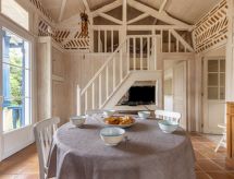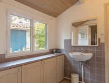 Lacanau: Einfamilienhaus "Fleur des Dunes". Im Ortszentrum von Lacanau, zentrale Lage, 200 m vom Meer, 6 km vom See, 200 m vom Strand. Zur Alleinbenutzung: Naturgarten 200 m2, Einzelgarage. Einkaufsgeschäft, Supermarkt 100 m, Restaurant 200 m. Golfplatz (18 Loch) 5 km. Nahe gelegene Sehenswürdigkeiten: Bordeaux 60 km, Cap ferret 70 km, Dune du pilat 70 km, Saint Emilion 80 km. Surfen kann man einfach nicht beschreiben. Wellenreiten muss man erlebt haben. Hier bietet sich die Chance.Interior