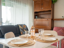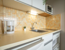 1-Zimmer-Wohnung 25 m2 im 5. Stock. Wohn-/Esszimmer mit 1 Doppeldiwanbett (140 cm, Länge 190 cm), TV (Flachbildschirm). Eingang mit 1 x 2 Etagenbetten (90 cm, Länge 190 cm). Kochnische (2 Kochplatten, Mini-Backofen, Toaster, Wasserkocher, Mikrowelle, elektrische Kaffeemaschine). Bad, sep. WC. Heizung. Terrasse 8 m2, Südlage. Terrassenmöbel. Sicht auf das Schwimmbad. Zur Verfügung: Internet (Wireless LAN, extra). Parkplatz. Bitte beachten: Rauchmelder. Residenz. Das Haus ist auch mit einem Babybett ausgestattet. Es gibt ein Internetanschluss. Zur Verfügung steht ein Mikrowellengerät.- Charakteristik des Mietobjekts