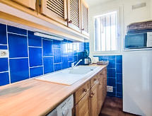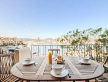 2-Zimmer-Wohnung 45 m2 im 1. Stock, Nordostlage. Komfortabel eingerichtet: Wohn-/Esszimmer mit 1 Doppeldiwanbett (140 cm, Länge 190 cm), TV (Flachbildschirm), Ventilator. Ausgang zur Terrasse. 1 Zimmer mit 1 franz. Bett (160 cm, Länge 190 cm). Offene Küche (4 Kochplatten, Backofen, Geschirrspüler, Mikrowelle, Tiefkühler, elektrische Kaffeemaschine). Bad, sep. WC. Terrasse 16 m2. Terrassenmöbel, Liegestühle (2). Schöne Sicht auf den Hafen. Zur Verfügung: Waschmaschine. Internet (Wireless LAN, extra). Bitte beachten: kein Parkplatz. Rauchmelder. Das Haus ist auch mit einem Babybett ausgestattet. Es hat ein Ofen.- Charakteristik des Mietobjekts