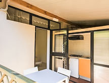 1-Zimmer-Reihenhaus 20 m2, im Erdgeschoss. Renoviert, zweckmässig eingerichtet: Wohn-/Schlafzimmer mit Veranda mit 1 Bett, 1 Doppelbett und TV. Ausgang zur Veranda. Kochnische (2 Kochplatten). Dusche/WC. Klimaanlage (extra). Terrassenmöbel. Zur Verfügung: Haartrockner. Parkplatz (1 Auto). Bitte beachten: Kühlschrank ohne Gefrierfach. TV nur IT. Der Küchenbereich befindet sich auf der privaten Veranda/Loggia-Bereich (draussen) und verfügt über eine Küchenecke mit 2 Kochfeldern und einem kleinen Kühlschrank. Frisch geduscht und duftend kann man entspannt zum Ferienprogramm übergehen, denn eine Dusche ist vorhanden. Lust im Urlaub nicht immer selber zu kochen? Gönnen Sie sich einen Besuch im angeschlossenen Restaurant. Mit eingezäuntem Grundstück. Der Spielplatz, der für Kinder geeignet ist steht zur Verfügung. Es gibt ein Kinderbecken. Es hat ein Wäschetrockner. Es gibt ein Tischtennistisch.- Ausstattung