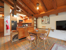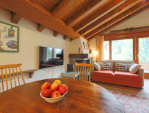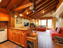 2-Zimmer-Wohnung 65 m2, im Dachgeschoss. Teilweise abgeschrägt, einfach und gemütlich eingerichtet: Wohn-/Schlafzimmer mit 2 Diwanbetten (80 cm, Länge 200 cm), Esstisch und TV. Ausgang zum Balkon. 1 Zimmer mit 2 Betten (90 cm, Länge 210 cm). Offene Küche (4 Kochplatten, Backofen, Geschirrspüler, Toaster, Wasserkocher, Mikrowelle, Tiefkühler, elektrische Kaffeemaschine, Racletteofen, Fondue Set (Käse)). Bad/WC. Balkon. Balkonmöbel. Schöne, auf Matterhorn. Zur Verfügung: Haartrockner. Internet (Wireless LAN, gratis). Bitte beachten: Nichtraucher-Unterkunft. Es gibt WLAN (Drahtloses lokales Netzwerk).- Ausstattung