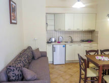 "Hermes", 1-Zimmer-Studio 26 m2, im Erdgeschoss. Komfortabel und schön eingerichtet: offenes Wohn-/Schlafzimmer mit 1 Diwanbett, 1 Doppelbett und Sat-TV (Flachbildschirm), CD und DVD. Ausgang zur Terrasse. Kochnische (2 Kochplatten, elektrische Kaffeemaschine) mit kleinem Esstisch. Dusche/WC. Klimaanlage. Terrasse. Schöne Sicht auf den Garten. Zur Verfügung: Haartrockner. Internet (Wireless LAN, gratis). 0311Κ10300270301 Das Haus ist auch mit einer Terrasse ausgestattet. Ein Pool ist verfügbar. Mit Reinigung. Es gibt ein DVD Spieler.- Charakteristik des Mietobjekts
