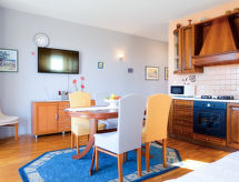 2-Zimmer-Wohnung 42 m2, im Erdgeschoss. Wohn-/Esszimmer mit 1 Doppeldiwanbett (150 cm, Länge 200 cm), Sat-TV (Flachbildschirm), Klimaanlage. Ausgang zum Balkon. 1 Zimmer mit 1 Doppelbett (2 x 90 cm, Länge 200 cm). Offene Küche (Backofen, Geschirrspüler, 1 Glaskeramikherd Platte, 3 Flammen, Toaster, Wasserkocher, Mikrowelle, elektrische Kaffeemaschine). Bad/WC. Balkon. Balkonmöbel. Sicht auf das Meer. Zur Verfügung: Internet (Wireless LAN, gratis). Bitte beachten: Nichtraucher-Unterkunft. Eigener Eingang. Eine Badewanne ist verfügbar. Aussicht auf das Meer und Lage sind traumhaft. Ein Balkon ist vorhanden.- Ausstattung