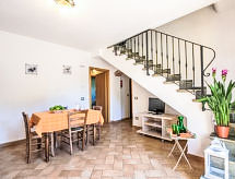 3-Zimmer-Wohnung 75 m2 auf 2 Stockwerken, im Erdgeschoss. Zweckmässig und geschmackvoll eingerichtet: Wohn-/Esszimmer mit 1 Doppeldiwanbett, Sat-TV und Klimaanlage. 1 Doppelzimmer mit Klimaanlage. Kochnische (4 Kochplatten, Backofen). Dusche/Bidet/WC. Obergeschoss: 1 Doppelzimmer mit Klimaanlage. Dusche/Bidet/WC. Die tägliche Reinigung unter der Brause braucht wenig Zeit. Die Dusche dazu steht bereit. Die drückende Hitze kann Körper und Gemüt stark belasten. Deshalb sind die Räumlichkeiten mit Klimaanlagen ausgestattet.- Ausstattung