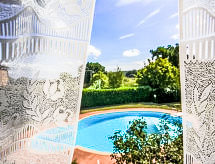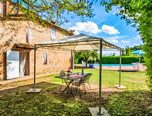 "Il Valacchio", 3-Zimmer-Haus 45 m2 auf 2 Stockwerken, im Erdgeschoss. Sehr einfach und rustikal eingerichtet: kleine Küche (2 Kochplatten) mit Esstisch. Obergeschoss: kleines Wohnzimmer. 1 Doppelzimmer. 1 Zimmer mit 1 x 2 Etagenbetten. Dusche/Bidet/WC. G-Heizung. Das Badezimmer hat eine Raumhöhe von 1.5 m bis 2.1 m. Eine Dusche zur ist Stelle. Nur schnell shampooniert und abgeduscht und schon kann ein neuer Urlaubstag beginnen. Eine Veranda ist verfügbar. Das Haus ist auch mit einem Pool ausgestattet. Es gibt ein privater Pool.- Ausstattung