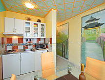 4-Zimmer-Wohnung 75 m2 im 1. Stock, Ostlage. Wohn-/Esszimmer mit Sat-TV (Flachbildschirm), Klimaanlage. Wohnzimmer mit 1 Diwanbett (140 cm, Länge 200 cm). Ausgang zum Balkon. 1 Zimmer mit 1 franz. Bett (160 cm, Länge 190 cm). 1 Zimmer mit 2 x 1 Etagenbetten (90 cm, Länge 190 cm). Offene Küche (2 Kochplatten, Mikrowelle, elektrische Kaffeemaschine). Dusche/Bidet/WC. Klimaanlage (extra). Balkon 5 m2. Balkonmöbel. Herrliche Sicht auf den See. Zur Verfügung: Internet (Wireless LAN, gratis). 1 Haustier/Hund erlaubt. Die Klimaanlage sorgt für eine gute Raumtemperierung. Denn der Wohlfühlfaktor spielt eine wichtige Rolle und ist uns wichtig. Das Haus ist auch mit einem Balkon ausgestattet.- Ausstattung