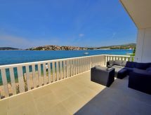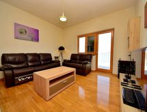 3-Zimmer-Wohnung 60 m2 im 1. Stock, Westlage. Wohn-/Esszimmer mit Kabel-TV (Flachbildschirm), Klimaanlage. Ausgang zur Terrasse. 1 Zimmer mit 1 franz. Bett (180 cm, Länge 200 cm), Klimaanlage. Ausgang zur Terrasse. 1 Zimmer mit 1 franz. Bett (160 cm, Länge 200 cm), Klimaanlage. Offene Küche (Backofen, Geschirrspüler, 4 Glaskeramikherd Platten, Mikrowelle, Tiefkühler). Dusche/WC. Terrasse 30 m2, Terrasse 18 m2, überdacht. Terrassenmöbel, Liegestühle (2). Sehr schöne Sicht auf das Meer. Zur Verfügung: Waschmaschine. Internet (Wireless LAN, gratis). Überdies werden sie verwöhnt mit einem freien Blick auf das Meer. Informieren Sie sich im über den vorhandenen TV Apparat. Ob lokale Neuigkeiten oder internationale Nachrichten, mit dem Fernsehen sind sie stehts gut informiert.- Ausstattung