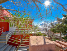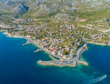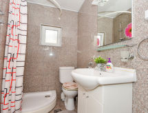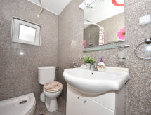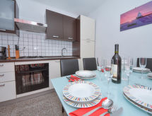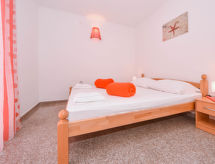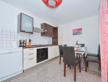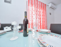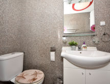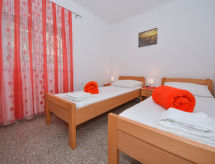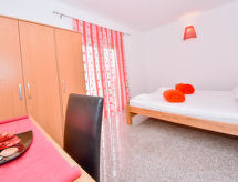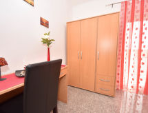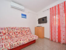 3-Zimmer-Wohnung 58 m2 im 1. Stock. Wohnzimmer 15 m2 mit 1 Doppeldiwanbett (130 cm, Länge 190 cm), Sat-TV (Flachbildschirm). 1 Zimmer mit 1 Doppelbett (2 x 90 cm, Länge 200 cm). 1 Zimmer mit 2 Betten (90 cm, Länge 200 cm). Esszimmer mit Klimaanlage. Ausgang zur Terrasse. Offene Küche (4 Kochplatten, Backofen, Geschirrspüler, Tiefkühler, elektrische Kaffeemaschine). Dusche/WC. Terrasse 8 m2. Terrassenmöbel. Fernsicht auf das Meer. Zur Verfügung: Haartrockner. Internet (Wireless LAN, gratis). Die tägliche Reinigung unter der Brause braucht wenig Zeit. Die Dusche dazu steht bereit. Mit eingezäuntem Grundstück. Treten Sie ein und spüren die erfrischende Brise der Klimaanlage.- Ausstattung