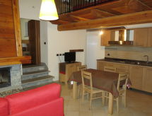 "La Borgata (SMY726)", 2-Zimmer-Wohnung 63 m2 auf 2 Stockwerken im 2. Stock. Geschmackvoll und gemütlich eingerichtet: Wohn-/Esszimmer mit offenem Kamin, Esstisch und TV. Ausgang zur Terrasse. 1 Zimmer mit 1 Doppelbett. Zwischenstock mit 2 Betten. Kleine, offene Küche (4 Flammen, Mikrowelle). Dusche/WC. G-Heizung. Parkettböden. Terrasse. Terrassenmöbel. Panoramasicht. Zur Verfügung: Kinderhochstuhl, Babybett. Bitte beachten: eigener Eingang. Auf Platz befindet sich ein Restaurant. Wir freuen uns, Ihnen bei Ihrem Urlaub Halbpension anbieten zu können. Wir offerieren unseren Gästen auch Frühstück an. Der Spielplatz, der für Kinder geeignet ist steht zur Verfügung. Eine Feuerstelle ist vorhanden. Es hat ein Parkplatz.- Charakteristik des Mietobjekts