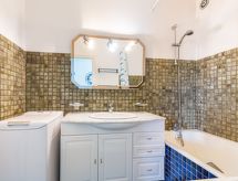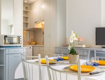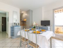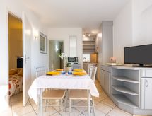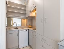 1-Zimmer-Wohnung 39 m2, im Erdgeschoss. Komfortabel eingerichtet: Wohn-/Esszimmer mit TV (Flachbildschirm). Ausgang zur Terrasse. Kabine mit 1 franz. Bett (1 x 140 cm, Länge 190 cm). Kabine mit 1 franz. Bett (1 x 140 cm, Länge 190 cm). Küche (Mini-Backofen, Geschirrspüler, Mikrowelle, Tiefkühler, elektrische Kaffeemaschine). Bad, sep. WC. E-Heizung. Terrasse. Terrassenmöbel, Abstellkammer. Zur Verfügung: Waschmaschine, Babybett. Parkplatz Nr. 16. Bitte beachten: Rauchmelder. Residenz. Badewanne im Haus. Dank der Waschmaschine die Sie vorfinden, sind weniger Kleider zum mitschleppen.- Charakteristik des Mietobjekts
