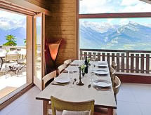 "La Truffe", 5-Zimmer-Chalet 120 m2 auf 2 Stockwerken. Komfortabel und modern eingerichtet: grosses Wohn-/Esszimmer mit Panoramafenster mit offenem Kamin, Kabel-TV und DVD. Ausgang zur Terrasse. Galerie. Offene Küche (Backofen, Geschirrspüler, 4 Glaskeramikherd Platten, Mikrowelle, elektrische Kaffeemaschine, Kapseln für die Kaffeemaschine (Nespresso) extra, Racletteofen, Fondue Set (Käse)). Dusche/WC. E-Heizung. Unteres Geschoss: 2 Zimmer, jedes Zimmer mit 1 franz. Bett (160 cm, Länge 200 cm). 2 Zimmer, jedes Zimmer mit 2 Betten (190 cm, Länge 190 cm). Bad/WC. Balkon, Nordlage, grosse Terrasse, Südwestlage. Gartengrill (mobil). Sehr schöne Panoramasicht auf die Berge und das Tal. Zur Verfügung: Waschmaschine, Wäschetrockner, Kinderhochstuhl, Babybett, Haartrockner. Internet (Wireless LAN, gratis). Parkplatz (1 Auto), Garage, Höhe 195 cm, Breite 250 cm. Bitte beachten: Nichtraucher-Unterkunft. Geeignet für ein Barbecue. Eine Feuerstelle ist vorhanden. Ein Wäschetrockner ist verfügbar. Ein DVD Spieler ist vorhanden.- Charakteristik des Mietobjekts