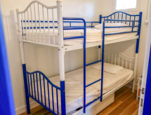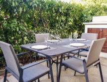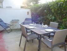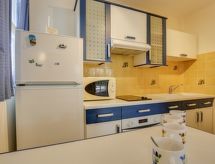 1-Zimmer-Studio 34 m2, im Erdgeschoss. Zweckmässig eingerichtet: Wohn-/Esszimmer mit 1 Doppeldiwanbett (1 x 140 cm, Länge 190 cm), TV (Flachbildschirm). Ausgang zur Terrasse. Kabine mit 1 x 2 Etagenbetten (90 cm, Länge 190 cm). Offene Küche (Backofen, 2 Glaskeramikherd Platten, Mikrowelle, Tiefkühler, elektrische Kaffeemaschine). Dusche/WC. E-Heizung. Terrasse 15 m2, Westlage. Terrassenmöbel, Elektrogrill, Liegestühle (2). Zur Verfügung: Bügeleisen, Haartrockner. Internet (Wireless LAN, gratis). Parkplatz Nr. 21 (1 Auto). Bitte beachten: Rauchmelder. Ist ein regelmäßiges Duschritual fest im Tagesablauf verankert? Das schaffen wir, denn eine Dusche ist vorhanden.- Charakteristik des Mietobjekts