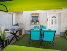 3-Zimmer-Wohnung 60 m2, im Erdgeschoss. Wohn-/Esszimmer mit Sat-TV (Flachbildschirm), Klimaanlage. 1 Zimmer mit 1 franz. Bett (160 cm, Länge 200 cm). 1 Zimmer mit 1 x 2 Etagenbetten (90 cm, Länge 200 cm). Offene Küche (Backofen, 4 Glaskeramikherd Platten, Wasserkocher, Mikrowelle, Tiefkühler). Dusche/WC. Zur Verfügung: Waschmaschine. Internet (Wireless LAN, gratis). Ein Ofen ist verfügbar.- Ausstattung