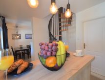 3-Zimmer-Haus 57 m2 auf 2 Stockwerken. Wohn-/Esszimmer mit 1 Doppeldiwanbett (160 cm, Länge 200 cm), TV (Flachbildschirm). Ausgang zur Terrasse. Offene Küche (Backofen, Geschirrspüler, 4 Flammen, Wasserkocher, Mikrowelle, elektrische Kaffeemaschine). Dusche/WC. Dachgeschoss: (Wendeltreppe) Eingang mit Klimaanlage. 1 abgeschrägtes Zimmer, Deckenhöhe 110 - 247 cm mit 1 franz. Bett (160 cm, Länge 200 cm). 1 abgeschrägtes Zimmer, Deckenhöhe 110 - 247 cm mit 2 Betten (90 cm, Länge 200 cm). Terrasse 27 m2, überdacht. Terrassenmöbel. Eingeschränkte Sicht auf das Meer. Zur Verfügung: Bügeleisen, Haartrockner. Internet (Wireless LAN, gratis). Gerade nach einem erlebnisreichen Ferientag hilft ein kurzes Brausebad um sich zu erfrischen. Dank der verfügbaren Dusche ein wahres Vergnügen. Die drückende Hitze kann Körper und Gemüt stark belasten. Deshalb sind die Räumlichkeiten mit Klimaanlagen ausgestattet.- Ausstattung