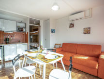 1-Zimmer-Studio 25 m2 im 2. Stock. Objekt geeignet für 2 Erwachsene + 1 Kind. Wohn-/Esszimmer mit 1 Doppeldiwanbett (140 cm, Länge 190 cm), 1 Wandklappbett (90 cm, Länge 190 cm), TV (Flachbildschirm). Ausgang zur Terrasse. Kochnische (4 Kochplatten, Mikrowelle, elektrische Kaffeemaschine). Bad, sep. WC. Klimaanlage. Terrasse 8 m2, Südlage. Terrassenmöbel. Schöne Sicht auf den Hafen. Zur Verfügung: Internet (Wireless LAN, extra). Bitte beachten: kein Parkplatz. Rauchmelder. Residenz. Auch wenn es in der Nacht noch so heiss bleibt, ist es schön, kann man die Klimaanlage einschalten und in einem angenehm temperierten Raumklima schlafen. Das Haus ist auch mit einer Terrasse ausgestattet. Sollte das Wetter einmal nicht mitspielen, ist auch ein Fernseher vorhanden. Um auch mal was schnell selber zuzubereiten, steht ein Mikrowellenofen parat.- Charakteristik des Mietobjekts