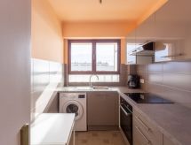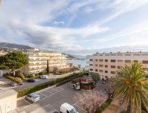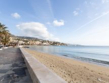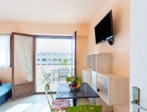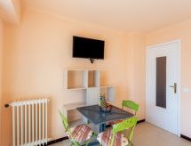 1-Zimmer-Studio 30 m2 im 3. Stock. Komfortabel eingerichtet: Wohn-/Schlafzimmer mit 1 Bett (90 cm, Länge 190 cm), 1 Doppeldiwanbett (140 cm, Länge 190 cm), Esstisch und TV (Flachbildschirm). Ausgang zur Terrasse. Küche (4 Glaskeramikherd Platten, Toaster, Wasserkocher, Mikrowelle, elektrische Kaffeemaschine). Dusche/WC. G-Heizung. Terrasse 15 m2, Ostlage. Terrassenmöbel, Liegestühle (3). Schöne Sicht auf das Meer. Zur Verfügung: Waschmaschine, Bügeleisen, Haartrockner. Internet (Wireless LAN, extra). Garage Nr. 17. Bitte beachten: Nichtraucher-Unterkunft. 1 Haustier/Hund erlaubt. Rauchmelder. Bietet wunderschöne Aussicht aufs Meer. Dank der Waschmaschine die Sie vorfinden, sind weniger Kleider zum mitschleppen.- Ausstattung
