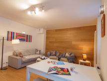 3-Zimmer-Wohnung 48 m2 im 2. Stock. Wohn-/Esszimmer mit TV (Flachbildschirm). Ausgang zum Balkon. 1 grosses Zimmer mit 1 franz. Bett (140 cm, Länge 190 cm), Bad. 1 Zimmer mit 1 x 2 Etagenbetten (90 cm, Länge 190 cm). Ausgang zum Balkon. Offene Küche (Backofen, Geschirrspüler, 4 Induktionskochplatten, Toaster, Mikrowelle, elektrische Kaffeemaschine). Dusche, sep. WC. Balkon 5 m2, Nordwestlage. Schöne Sicht auf die Berge. Zur Verfügung: Internet (Wireless LAN, extra). Parkplatz Nr. 1 en sous-sol in 500 m. Bitte beachten: Nichtraucher-Unterkunft. TV nur FR. Rauchmelder. Residenz. Ein Babybett ist verfügbar. Es hat ein Internetanschluss.- Charakteristik des Mietobjekts