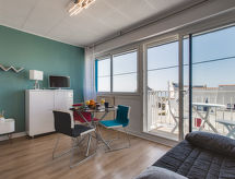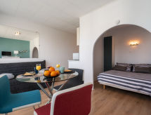 1-Zimmer-Studio 25 m2. Vollständig renoviert im Jahre 2019, komfortabel eingerichtet: Wohn-/Esszimmer mit TV (Flachbildschirm), DVD. Ausgang zum Balkon. Schlafnische mit 1 franz. Bett (1 x 140 cm, Länge 190 cm). Kleine Küche im Eingang (2 Kochplatten, elektrische Kaffeemaschine, Kapseln für die Kaffeemaschine (Dolce Gusto) extra, Kombinationsmikrowelle). Dusche/WC. E-Heizung. Balkon 6 m2. Balkonmöbel. Seitliche Sicht auf das Meer. Zur Verfügung: Waschmaschine. Internet (Wireless LAN, gratis). Parkplatz Nr. 18. 1 kleines Haustier/Hund erlaubt. Residenz.- Charakteristik des Mietobjekts