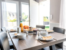4-Zimmer-Haus 100 m2 auf 2 Stockwerken. Komfortabel und schön eingerichtet: Wohn-/Esszimmer mit TV (Flachbildschirm). Ausgang zur Terrasse. 1 Zimmer mit 1 franz. Bett (1 x 160 cm, Länge 190 cm), Dusche/WC. Ausgang zur Terrasse. Offene Küche (Backofen, Geschirrspüler, 3 Induktionskochplatten, Mikrowelle, Tiefkühler, elektrische Kaffeemaschine, Kapseln für die Kaffeemaschine (nespresso) extra). Sep. WC. Obergeschoss: 2 abgeschrägte Zimmer, jedes Zimmer mit 1 franz. Bett (1 x 140 cm, Länge 190 cm). Dusche/WC. Kleine Terrasse, kleiner Garten. Terrassenmöbel. Zur Verfügung: Waschmaschine. Internet (Wireless LAN, gratis). Bitte beachten: 1 kleines Haustier/Hund erlaubt. Rauchmelder.- Ausstattung