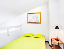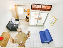 1-Zimmer-Studio 37 m2 auf 2 Stockwerken im 3. Stock. Wohn-/Esszimmer mit 1 Doppeldiwanbett (120 cm, Länge 190 cm), TV (Flachbildschirm). Ausgang zur Terrasse. Kochnische (2 Kochplatten, Mini-Backofen, Mikrowelle). Dusche, sep. WC. Obergeschoss: Galerie, Deckenhöhe 180 - 280 cm mit 1 Doppeldiwanbett (130 cm, Länge 190 cm). Terrasse 6 m2, Ostlage. Terrassenmöbel. Schöne Sicht auf das Meer und das Schwimmbad. Zur Verfügung: Internet (Wireless LAN, extra). Parkplatz. Bitte beachten: Rauchmelder. Residenz. Objekt verfügt über einen Aufzug. Das Grundstück ist komplett eingezäunt. Überdies werden sie verwöhnt mit einem freien Blick auf das Meer. Ein Babybett ist vorhanden. Ein Pool ist verfügbar. Ein Kinderbecken ist verfügbar.- Charakteristik des Mietobjekts