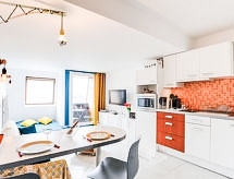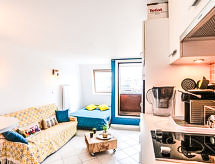 1-Zimmer-Studio 25 m2 im 5. Stock, Ostlage. Hell, vollständig renoviert, schön und modern eingerichtet: Eingang. Wohn-/Esszimmer mit 1 Doppeldiwanbett (1 x 140 cm, Länge 190 cm), TV (Flachbildschirm), Radio. Ausgang zum Balkon. Kochnische (2 Induktionskochplatten, Toaster, Wasserkocher, elektrische Kaffeemaschine, Kombinationsmikrowelle). Dusche/WC. E-Heizung. Balkon 1 m2. Balkonmöbel. Sehr schöne Panoramasicht auf das Meer und die Landschaft. Zur Verfügung: Internet (Wireless LAN, gratis). Bitte beachten: Nichtraucher-Unterkunft. Rauchmelder. 14220 000106 OZ Duschen ist belebend und eine Brause ist zugegen. Sie gelangen mit dem Aufzug zur Etage der Wohnung. Bietet wunderschöne Aussicht aufs Meer.- Charakteristik des Mietobjekts