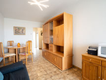 2-Zimmer-Wohnung 40 m2 im 5. Stock. Wohn-/Esszimmer mit 1 Doppeldiwanbett (140 cm, Länge 190 cm), TV (Flachbildschirm), Radio. Ausgang zur Terrasse. 1 Zimmer mit 1 franz. Bett (1 x 140 cm, Länge 190 cm). Ausgang zum Balkon. Kochnische (Mini-Backofen, 2 Glaskeramikherd Platten, Toaster, Wasserkocher, Mikrowelle, elektrische Kaffeemaschine) mit Radio. Bad, sep. WC. Terrasse 8 m2. Terrassenmöbel. Sicht auf den Hafen. Zur Verfügung: Waschmaschine, Bügeleisen. Internet (Wireless LAN, extra). Parkplatz Nr. 47. Bitte beachten: Maximal 1 Haustier/Hund erlaubt. Rauchmelder. Haustiere sind erlaubt. Lassen Sie Ihren Hund mitschnuppern an den schönsten Tagen im Jahr. Informieren Sie sich im über den vorhandenen TV Apparat. Ob lokale Neuigkeiten oder internationale Nachrichten, mit dem Fernsehen sind sie stehts gut informiert.- Charakteristik des Mietobjekts