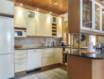 Maximal 2 Haustiere/Hunde erlaubt. 170 km nördlich von Rovaniemi, im Ferienort von Levi, in der Gegend Kätkä. Block-Ferienhaus, Baujahr 2005. Erdgeschoss: Wohnküche, Schlafzimmer mit 2 Betten, Sauna, Badezimmer, Ankleidezimmer, Hauswirtschaftszimmer, separate Toilette, Abstellraum und überdachte Terrasse. Obergeschoss: 3 Schlafzimmer mit je 2 Einzelbetten, 1 Schlafzimmer mit Zugang zum Balkon, Toilette. Reisebett und Hochstuhl fürs Baby. Sofa im Wohnzimmer kann zum Schlafen verwendet werden. Makarios ist eine geräumige und komfortable Villa, in einer ruhigen Gegend. Bitte beachten, dass die Buchungen an diesem Ort am Abreisetag um 11:00 Uhr enden. Dienstleistungen des Zentrums Levi sind in der Nähe: Entfernung 2 km, 800 m mit dem Fahrrad und zu Fuss. Die nächste Piste ist Eturinne, 2.3 km entfernt. Restaurants, Thermalbad und andere Dienste 1.6 – 2.6 km. Die tägliche Reinigung unter der Brause braucht wenig Zeit. Die Dusche dazu steht bereit. Es gibt eine Feuerstelle. Informieren Sie sich im über den vorhandenen TV Apparat. Ob lokale Neuigkeiten oder internationale Nachrichten, mit dem Fernsehen sind sie stehts gut informiert. Unabhängiger sind Sie mit der eigens vorhandenen Waschmaschine.- Ausstattung