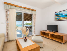 "Mare 1", 3-Zimmer-Wohnung 50 m2, im Erdgeschoss. Schön und modern eingerichtet: Wohn-/Esszimmer 28 m2 mit 1 Doppeldiwanbett, Sat-TV und Klimaanlage. Ausgang zur Terrasse. 1 Zimmer mit 1 Doppelbett (160 cm, Länge 200 cm). Ausgang zur Terrasse. 1 Zimmer mit 1 x 2 Etagenbetten. Offene Küche (4 Kochplatten, Backofen, Geschirrspüler, Mikrowelle, Tiefkühler). Dusche/WC. Grosse Terrasse 25 m2, überdacht, Terrasse 4 m2, überdacht. Terrassenmöbel, Liegestühle. Schöne Sicht auf das Meer. Zur Verfügung: Safe. Internet (Wireless LAN, gratis). Parkplatz. Mit eingezäuntem Grundstück. Ein Ort für Erholungsurlaube zum Sonnenbaden und Lesen im Garten. Bietet wunderschöne Aussicht aufs Meer. Das Haus ist auch mit einer Terrasse ausgestattet. Geeignet für ein Barbecue. Ein beheizter Pool ist vorhanden. Ein Kinderbecken ist verfügbar. Sollte das Wetter einmal nicht mitspielen, ist auch ein Fernseher vorhanden. Es hat ein Ofen.- Ausstattung
