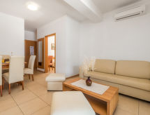 "Mare 2", 3-Zimmer-Wohnung 50 m2, im Erdgeschoss. Schön und modern eingerichtet: Wohn-/Esszimmer 18 m2 mit 1 Doppeldiwanbett, Sat-TV und Klimaanlage. Ausgang zur Terrasse. 1 Zimmer mit 1 Doppelbett (160 cm, Länge 200 cm). 1 Zimmer mit 1 x 2 Etagenbetten. Offene Küche (4 Kochplatten, Geschirrspüler, Mikrowelle, Tiefkühler). Dusche/WC. Terrasse 25 m2, überdacht. Terrassenmöbel. Schöne Sicht auf das Meer. Zur Verfügung: Safe. Internet (Wireless LAN, gratis). Parkplatz. Die Entspannung und das Lebensgefühl im Garten sind im Urlaub unverzichtbar. Überrascht Sie mit einer herrlichen Aussicht aufs Meer. Treten Sie ein und spüren die erfrischende Brise der Klimaanlage. Eine Veranda ist vorhanden. Es gibt ein beheizter Pool. Ein Kinderbecken ist vorhanden. Ein Internetanschluss ist verfügbar.- Ausstattung