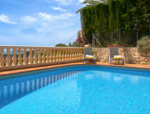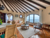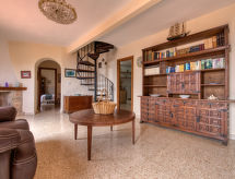 5-Zimmer-Haus 139 m2. Zweckmässig eingerichtet: Wohn-/Esszimmer mit offenem Kamin und Digital-TV. Ausgang zur Terrasse. 1 Zimmer mit 1 Ausziehbett (2 x 80 cm, Länge 190 cm). 1 Zimmer mit 2 Betten (200 cm, Länge 200 cm). Küche (4 Kochplatten, Tiefkühler, elektrische Kaffeemaschine). Dusche/WC. Unteres Geschoss: (Wendeltreppe) Wohnzimmer mit offenem Kamin. Ausgang zur Terrasse. 1 Zimmer mit 1 franz. Bett (160 cm, Länge 200 cm). Küche (4 Kochplatten, Backofen, Mikrowelle, Tiefkühler) mit Esstisch. Dusche/WC. Liegestühle (2). Herrliche Panoramasicht auf das Meer. Zur Verfügung: Waschmaschine, Bügeleisen, Kinderhochstuhl, Babybett. Internet (Wireless LAN, gratis). Parkplatz beim Haus. Bitte beachten: Parkplatz nur für kleine Wagen. 1 Haustier/Hund erlaubt. TV nur ES. AT-449047-A Hier wo Hunde erlaubt und willkomme Gäste sind lässt es sich gut ergehen. Aussicht auf das Meer und Lage sind traumhaft. Es hat eine Feuerstelle. Es hat ein privater Pool. Es gibt ein Ofen.- Ausstattung