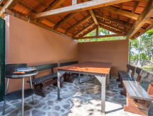 3-Zimmer-Haus 65 m2. Wohn-/Esszimmer mit Sat-TV (Flachbildschirm), Holzofen. 1 Zimmer mit 1 franz. Bett (140 cm, Länge 200 cm). 1 Zimmer mit 1 Bett (90 cm, Länge 190 cm), 1 franz. Bett (160 cm, Länge 200 cm). Offene Küche (4 Kochplatten, Backofen, Tiefkühler, elektrische Kaffeemaschine). Dusche/WC. Holzheizung. Terrasse 25 m2, Terrasse 10 m2, überdacht. Terrassenmöbel, Liegestühle. Zur Verfügung: Holz (gratis). Internet (Wireless LAN, gratis). Eine Terrasse ist vorhanden. Eine Feuerstelle ist verfügbar. Es hat ein privater Pool.- Ausstattung