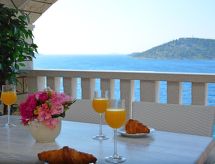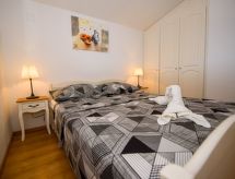 3-Zimmer-Wohnung 45 m2, im Dachgeschoss. Teilweise abgeschrägt, schön und geschmackvoll eingerichtet: Wohn-/Esszimmer mit Sat-TV (Flachbildschirm), Klimaanlage. Ausgang zur Terrasse. 2 Zimmer, jedes Zimmer mit 1 Doppelbett (2 x 80 cm, Länge 200 cm). Offene Küche (2 Glaskeramikherd Platten, Mikrowelle, Tiefkühler, elektrische Kaffeemaschine). Dusche/WC. Klimaanlage (extra). Grosse Terrasse 20 m2, überdacht, Südlage. Terrassenmöbel, Liegestühle (2). Herrliche Sicht auf das Meer. Zur Verfügung: Internet (Wireless LAN, extra). Überdies werden sie verwöhnt mit einem freien Blick auf das Meer. Es hat eine Terrasse. Geeignet zum Grillen. Ein überdachter Parkplatz ist verfügbar.- Ausstattung