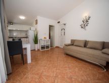 2-Zimmer-Wohnung 32 m2 im 2. Stock. Schön und geschmackvoll eingerichtet: Wohn-/Esszimmer mit 1 Doppeldiwanbett (160 cm, Länge 200 cm), Sat-TV (Flachbildschirm), Klimaanlage. Ausgang zum Balkon. 1 Zimmer mit 1 franz. Bett (160 cm, Länge 200 cm). Offene Küche (2 Glaskeramikherd Platten, Mikrowelle, Tiefkühler, elektrische Kaffeemaschine). Dusche/WC. Klimaanlage (extra). Balkon 6 m2. Terrassenmöbel. Zur Verfügung: Internet (Wireless LAN, extra). Damit es auch im Sommer angenehm kühl bleibt, verfügt dieses Ferienobjekt über eine Klimaanlage. Ein überdachter Parkplatz ist vorhanden.- Ausstattung