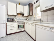 3-Zimmer-Wohnung 65 m2, im Erdgeschoss, Südlage. Wohn-/Esszimmer 30 m2 mit 1 Doppeldiwanbett (140 cm, Länge 200 cm), Sat-TV (Flachbildschirm), Klimaanlage. Ausgang zur Terrasse. 1 Zimmer mit 1 franz. Bett (160 cm, Länge 200 cm), Dusche/WC und TV (Flachbildschirm). 1 Zimmer mit 2 Betten (90 cm, Länge 200 cm), TV (Flachbildschirm). Offene Küche (Backofen, Geschirrspüler, 4 Glaskeramikherd Platten, Mikrowelle, Tiefkühler, elektrische Kaffeemaschine). Dusche/Bidet/WC. Warmluftheizung. Terrasse 7 m2, überdacht. Terrassenmöbel. Eingeschränkte Sicht auf das Meer. Zur Verfügung: Safe. Internet (Wireless LAN, gratis). Mit eingezäuntem Grundstück. Der Spielplatz, der für Kinder geeignet ist steht zur Verfügung. Ein Babybett ist vorhanden. Es hat ein beheizter Pool. Ein Ofen ist verfügbar.- Ausstattung