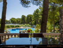 3-Zimmer-Wohnung 72 m2, im Erdgeschoss. Wohn-/Esszimmer mit 1 Doppeldiwanbett (135 cm, Länge 180 cm), Sat-TV und Klimaanlage. Ausgang zur Terrasse. 1 Zimmer mit 1 Doppelbett (2 x 80 cm, Länge 200 cm). Ausgang zur Terrasse. 1 Zimmer mit 2 Betten (80 cm, Länge 200 cm). Offene Küche (2 Kochplatten, Backofen, Wasserkocher, elektrische Kaffeemaschine). Dusche/WC. Terrasse 26 m2. Terrassenmöbel. Zur Verfügung: Telefon. Internet (Wireless LAN, gratis). Duschen ist belebend und eine Brause ist zugegen. Geniessen Sie Ihr Frühstück im angebundenen Restaurant. Gerne servieren wir Ihnen das Frühstück. Auf dem Spielplatz können sich die Kinder austoben. Damit es auch im Sommer angenehm kühl bleibt, verfügt dieses Ferienobjekt über eine Klimaanlage. Es hat ein Kinderbecken. Informieren Sie sich im über den vorhandenen TV Apparat. Ob lokale Neuigkeiten oder internationale Nachrichten, mit dem Fernsehen sind sie stehts gut informiert.- Ausstattung