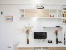 "Med", 3-Zimmer-Wohnung 40 m2. Hell, zweckmässig eingerichtet: Wohn-/Esszimmer mit Esstisch und Digital-TV. Ausgang zur Terrasse. 1 Doppelzimmer mit 1 franz. Bett (135 cm, Länge 190 cm). 1 Zimmer mit 1 Ausziehbett (2 Pers. 2 x 80 cm, Länge 190 cm). Kochnische (2 Induktionskochplatten, Toaster, Wasserkocher, Mikrowelle, Tiefkühler, elektrische Kaffeemaschine). Dusche/WC. Keine Heizmöglichkeit. Terrassenmöbel. Sicht auf die Ortschaft. Zur Verfügung: Waschmaschine, Bügeleisen, Kinderhochstuhl, Babybett bis 2 Jahre, Haartrockner. Internet (Wireless LAN, gratis). Bitte beachten: geeignet für Familien. 1 Haustier/Hund erlaubt. TV nur ES. HUTG063803 Objekt mit Lift. Ein Pool ist verfügbar. Das Haus ist auch mit einem Kinderbecken ausgestattet.- Ausstattung
