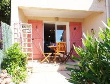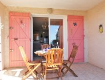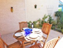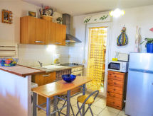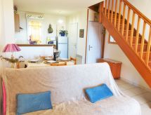 3-Zimmer-Reihenhaus 43 m2 auf 2 Stockwerken. Schön eingerichtet: Wohn-/Esszimmer mit TV (Flachbildschirm), Radio. Ausgang zur Terrasse. Offene Küche (Backofen, 4 Glaskeramikherd Platten, Mikrowelle, Tiefkühler) mit Durchreiche. Obergeschoss: 1 Zimmer mit 1 franz. Bett (140 cm). Ausgang zum Balkon. 1 Zimmer mit 2 Betten (90 cm). Dusche, sep. WC. E-Heizung. Terrasse 9 m2 teilweise überdacht, Südostlage, Gartensitzplatz. Terrassenmöbel, Gartengrill (mobil). Sicht auf das Meer. Zur Verfügung: Waschmaschine. Internet (Wireless LAN, extra). Parkplatz. Bitte beachten: Rauchmelder. Kleiner geschlossener Hof, 4 m2, von der Küche her erreichbar. Residenz. Überdies werden sie verwöhnt mit einem freien Blick auf das Meer. Es hat eine Veranda. Es hat ein Parkplatz. Es gibt ein Pool.- Charakteristik des Mietobjekts