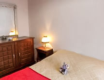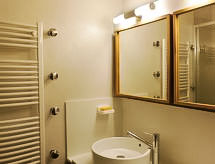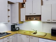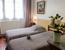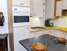 3-Zimmer-Wohnung 54 m2 im 3. Stock. Zweckmässig eingerichtet: Salon mit TV (Flachbildschirm), Radio und CD. 1 Zimmer mit 1 franz. Bett (1 x 140 cm, Länge 190 cm). 1 Zimmer mit 2 Betten (90 cm, Länge 190 cm). Offene Küche (2 Kochplatten, Backofen, Geschirrspüler, 2 Glaskeramikherd Platten, Mikrowelle, elektrische Kaffeemaschine) mit Esstisch. Dusche, sep. WC. G-Heizung. Zur Verfügung: Bügeleisen. Bitte beachten: geeignet für Familien. TV nur FR. Rauchmelder. WIFI nicht möglich. 35288000157DO- Ausstattung