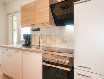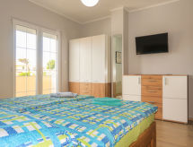 3-Zimmer-Wohnung 60 m2 im 1. Stock. Objekt geeignet für 6 Erwachsene + 1 Kind. Teilweise renoviert im Jahre 2019, komfortabel eingerichtet: 1 Zimmer mit 1 Doppelbett (2 x 90 cm, Länge 200 cm), 1 Klappbett, Dusche/WC, Sat-TV und Klimaanlage. Ausgang zum Balkon. 1 Zimmer mit 1 Doppelbett (2 x 90 cm, Länge 200 cm), Dusche/WC, Sat-TV und Klimaanlage. 1 Zimmer mit 1 Doppelbett (2 x 90 cm, Länge 200 cm), Dusche/WC, Sat-TV und Klimaanlage. Ausgang zum Balkon. Esszimmer mit Sat-TV. Ausgang zur Veranda. Offene Küche (Backofen, Geschirrspüler, 4 Glaskeramikherd Platten, Toaster, Wasserkocher, Mikrowelle, Tiefkühler, elektrische Kaffeemaschine). 2 Balkone 5 m2, Rasen 10 m2. Terrassenmöbel, Balkonmöbel, Gartengrill. Eingeschränkte Sicht auf das Meer. Zur Verfügung: Fliegengitter, Kinderhochstuhl, Babybett (extra). Internet (Wireless LAN, gratis). Bitte beachten: Nichtraucher-Haus. 1 Haustier/Hund erlaubt. Feuerlöscher. Veranda (Terrassenmöbel, Sat/TV). Der Genuss von Tabakwaren ist nicht gestattet. Treten Sie ein und spüren die erfrischende Brise der Klimaanlage. Sollte das Wetter einmal nicht mitspielen, ist auch ein Fernseher vorhanden.- Ausstattung